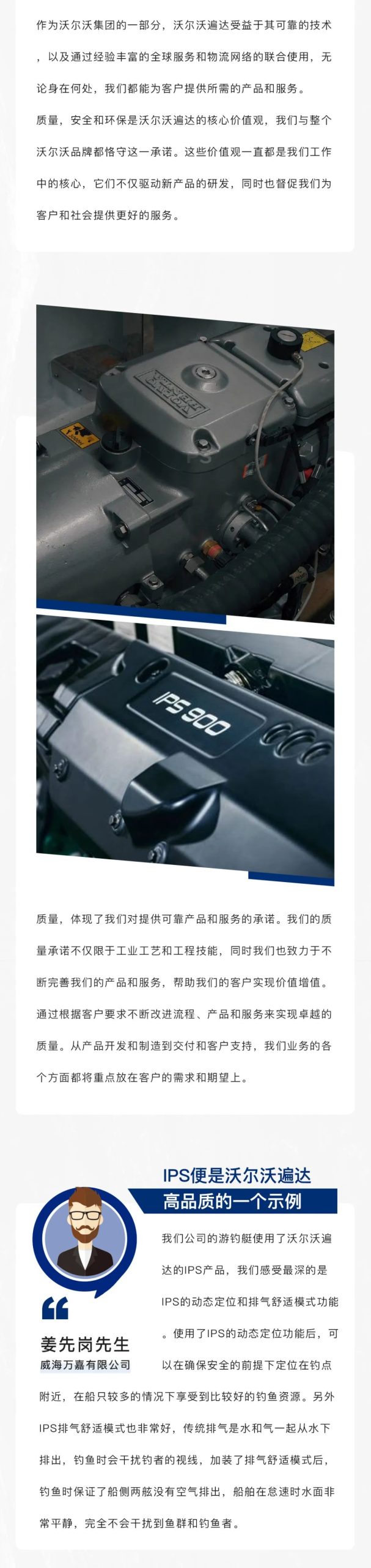 我國是海洋、航海大國,與航海相關(guān)的事業(yè)群,如航運、港口、漁業(yè)、造船、海洋石油開發(fā)等產(chǎn)業(yè)在我國國民經(jīng)濟和社會發(fā)展中占據(jù)十分重要的地位。沃爾沃遍達作為海洋動力解決方案的提供方,始終以優(yōu)質(zhì)的發(fā)動機產(chǎn)品及配套系統(tǒng)和不斷革新的技術(shù),助力航海相關(guān)行業(yè)的發(fā)展,保護海洋的原始生態(tài)環(huán)境。